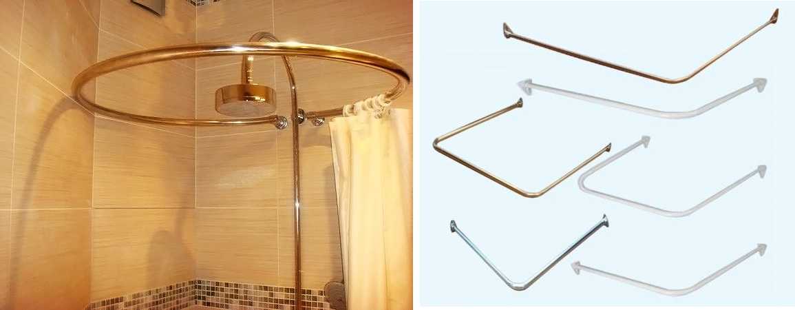 Если резервуары асимметричные и установлены в углу или нише, лучше использовать карнизы в форме дуги, когда изогнутую трубку фиксируют на смежной либо противоположной поверхности. При креплении подобных конструкций к потолку потребуется предусмотреть дополнительную опору у стены.