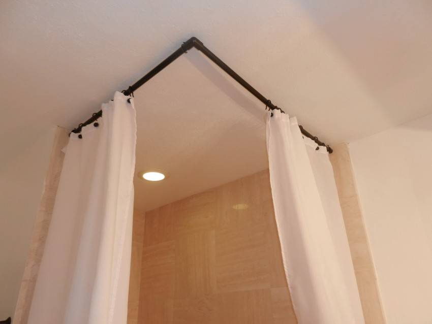 Угловой или Г-образный и П-образный карниз. Подходят они для квадратных душевых поддонов, которые установлены в углу (Г-образные) или у одной из стен (П-образные). У этих штанг на концах есть колпачки с отверстиями под крепеж. Тип крепежа выбирают в зависимости от стен (саморезы для деревянных стен, дюбеля для кирпича и бетона, специальные дюбеля-бабочки для гипсокартонных перегородок. Некоторые модели для большей устойчивости предусматривают наличие подвеса к потолку — обычно это стальная проволока, с потолочным креплением.