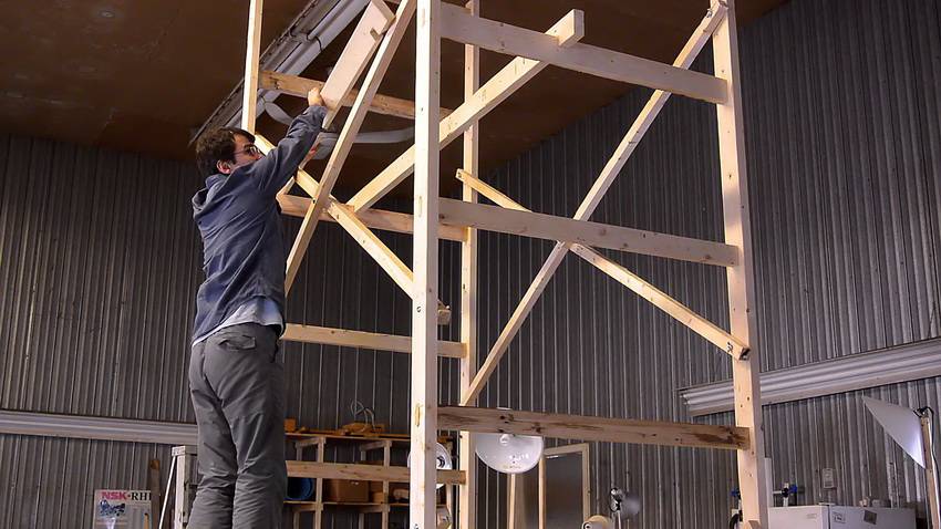 После того как подготовлена комплектация установки, приступают к ее сборке. Работа начинается с крупных функциональных элементов. На горизонтальную поверхность укладываются два бруса на расстоянии длины конструкции таким образом, чтобы верхушки элементов немного сходились, что добавит установке устойчивость. Например, если расстояние между нижними концами составляет 3 м, то между верхними должно быть не более 2,6 м. С внутренней стороны опор крепятся боковины, которые являются основанием для настилов. Аналогичная операция проделывается с двумя другими брусьями.
