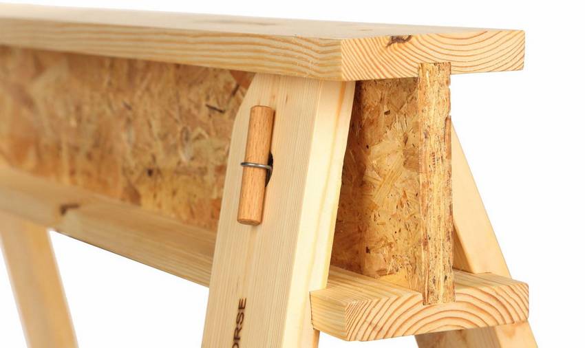 Строительный козел является четвероногим деревянным сооружением, напоминающим по форме букву «А», высота которого достигает роста мастера. Количество распорок может быть произвольное. Для соединения верхних концов опор применяются обычные навесы. Ножки фиксируются с помощью ограничителей. С одной из сторон стойка может быть выполнена вертикально, без наклона. Это позволит установить конструкцию ближе к стене, что удобно при покраске, конопатке или профилактической обработке.
