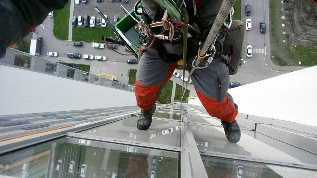 - сложность мытья фасада с внешней стороны. Большие стекла, выступающие в роли ограждающей конструкции при витражном остеклении, невозможно мыть изнутри. Поэтому приходится заниматься этим снаружи, что достаточно проблематично. Проблема усугубляется при наличии нескольких этажей – в таком случае требуется приглашение промышленных альпинистов или использование подъемной техники.