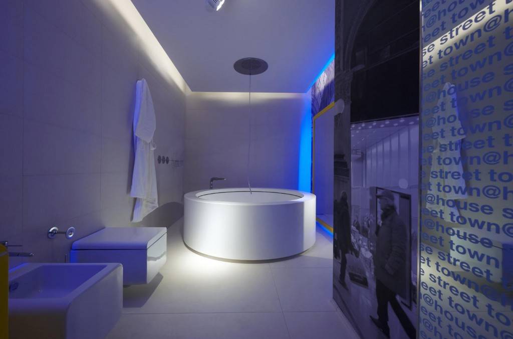 Если комната имеет просторную площадь, то эффектно при ее помощи можно выделить саму ванну. Стоит отметить и то, что сегодня существуют модели ванн, которые уже имеют встроенную подсветку.