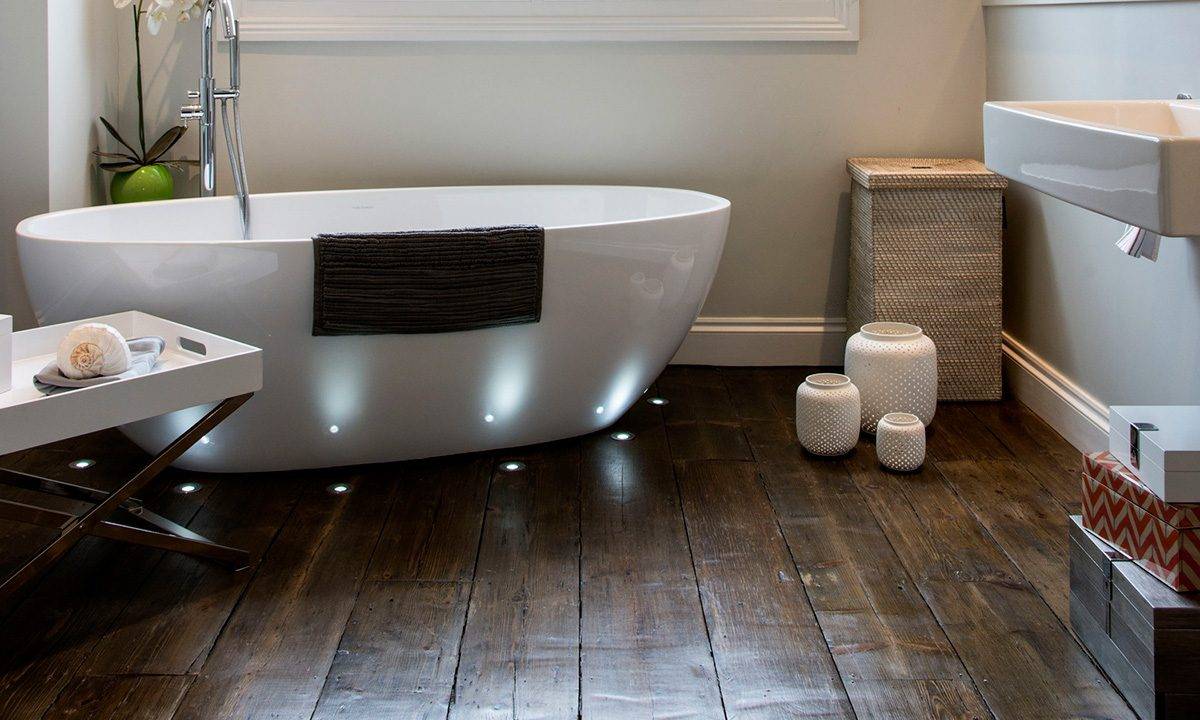Если высота потолков небольшая или ванна находится на постаменте, тогда прекрасным решением будут точечные элементы, которые устанавливаются практически в одну плоскость с поверхностью. В них можно монтировать любые подходящие светодиодные лампы. Желательно, чтобы они тоже были прикрыты рассеивателями, тогда глазу не придется долго привыкать к таким условиям. Для подсветки пространства возле санузла можно применять такие же варианты, как и для ванной.