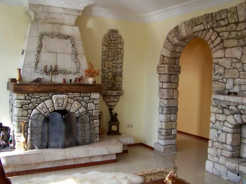 Этот материал очень легко режется с помощью ножовки. В последнее время все чаще начинают избавляться от межкомнатных дверей, при этом оставляя лишь дверные проемы. Дверной проем может иметь сложную форму, значительную высоту, толщину и ширину. Отделка откосов и дверных проемов декоративным камнем позволяет воплотить в жизнь самые буйные фантазии, создавая при этом очень интересный интерьер. Благодаря легкости этот материал можно клеить даже на перегородки, которые выполнены из гипсокартона.