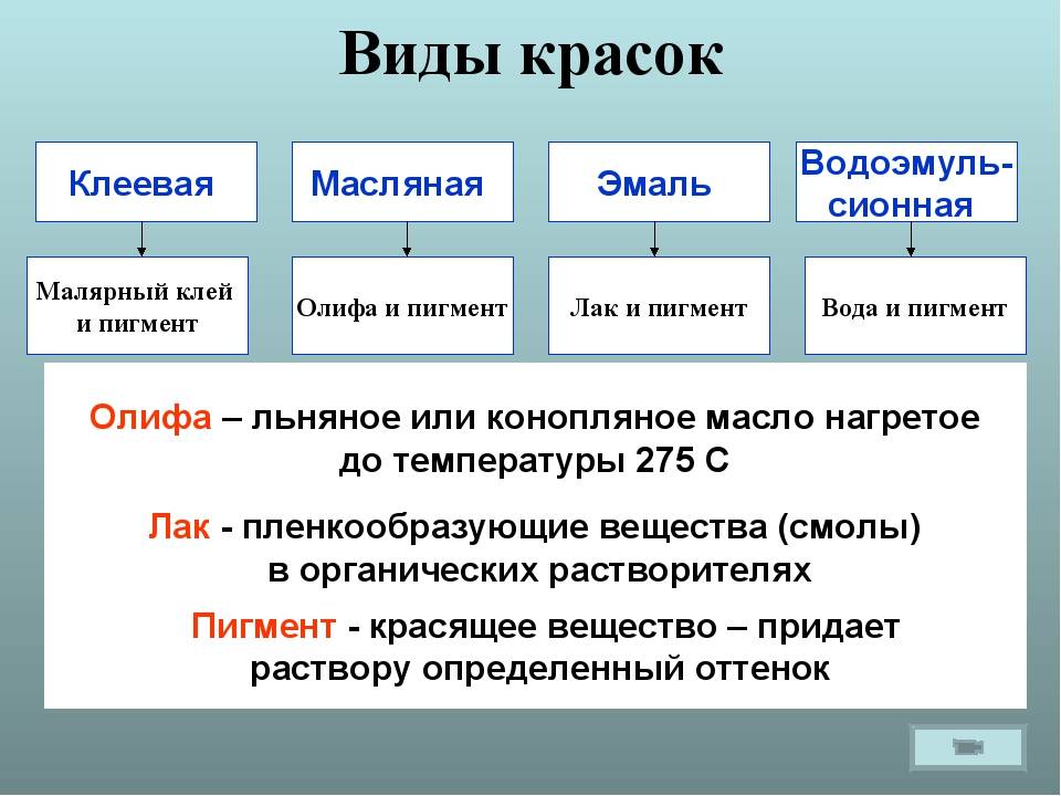 Масляные краски — старожилы на рынке. Их нельзя назвать современными. Масляные краски долго сохнут, имеют резкий запах, и часто требуют добавления олифы. Однако, имеют низкую стоимость, что является их плюсом.