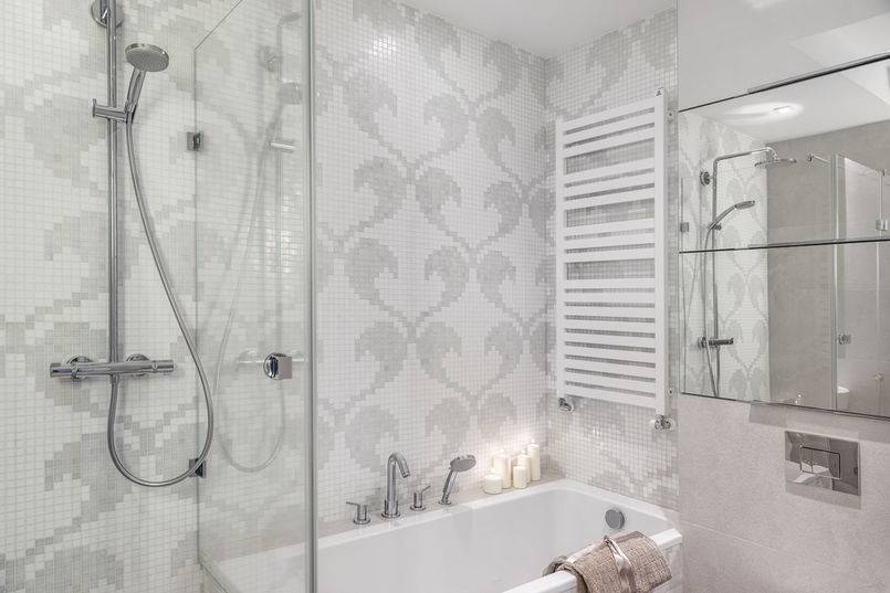 Типичная душевая кабина имеет высоту 200 см. Плитка на стене там должна быть размещена до ее верхнего края. Но если рядом установлена ванна или умывальник, хотя в этом нет необходимости, плитки в данных местах также можно укладывать на высоту до 2 м. В последнем случае внутренняя архитектура будет согласованной.