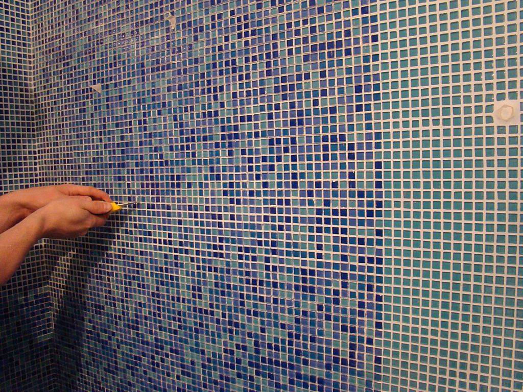 Как класть мозаику в ванной – понятно, а вот швы нужно заделывать только после полного высыхания клеящего состава, чтобы все элементы «сидели» плотно и не сдвигались при финальной обработке. Иначе вы получите мешанину из матриц, придется все переделывать. Чтобы не деформировать поверхность и не царапать элементы, затирку нужно наносить резиновыми мягкими инструментами.