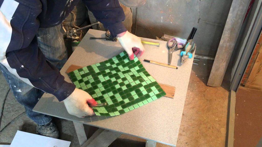 Совет мастера: так как не всегда плитка по рисунку кладется под ровным углом, желательно приобрести специальные кусачки, которыми удобно делить маленькие квадратики мозаики на различные геометрические формы.