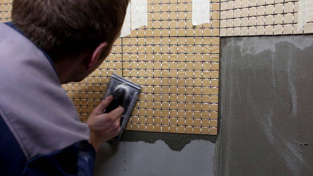 Толщина его должна быть не меньше 1 см. По приклеенной к стене мозаичной плите необходимо несильно постучать резиновым шпателем для лучшей сцепки клея со стеной