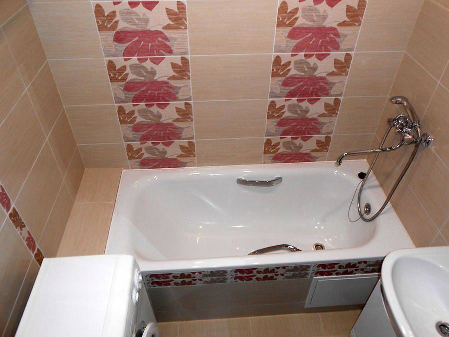 Укладка плитки со смещением производит меньшее впечатление монотонности, чем прямая отделка. Кроме того, такая раскладка плитки в ванной скроет незначительные отклонения углов стен от вертикали.