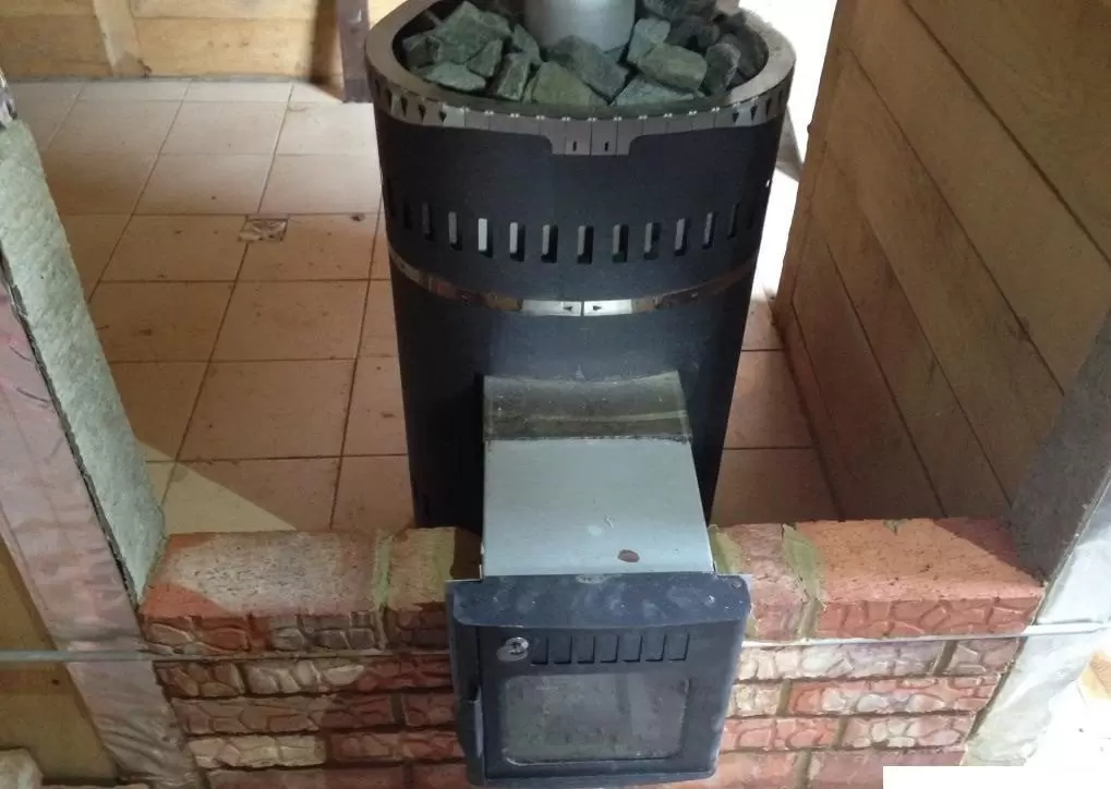 Сам процесс монтажа сложнее. В стене необходимо проделать большой проем, в который будет установлен топливник. Его укрывают шаром термоизоляции и пожароустойчивыми материалами. Если при возведении бани в проекте этого не было предусмотрено, придется разбирать необходимую часть стены, или выпиливать проем.
