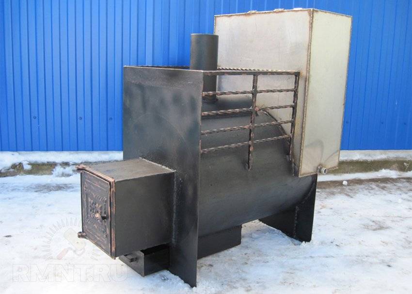 Коробку каменки устанавливают сверху конструкции, ближе к дымоходу. Передняя часть корпуса всегда оказывается холоднее. Часто она служит лишь для обогрева воздуха в помещении. В некоторых горизонтальных печах вывод дымохода изгибается. Это позволяет увеличить площадь контакта с камнями и баком для воды.