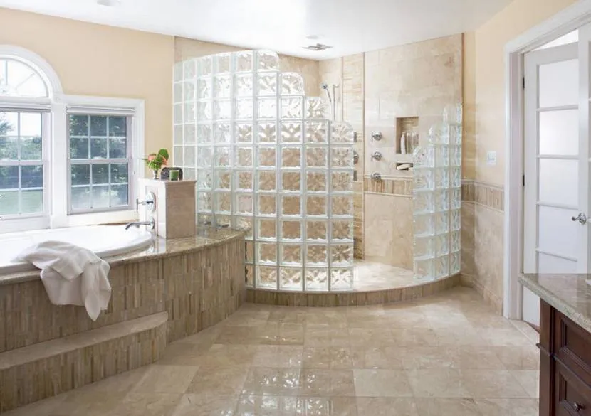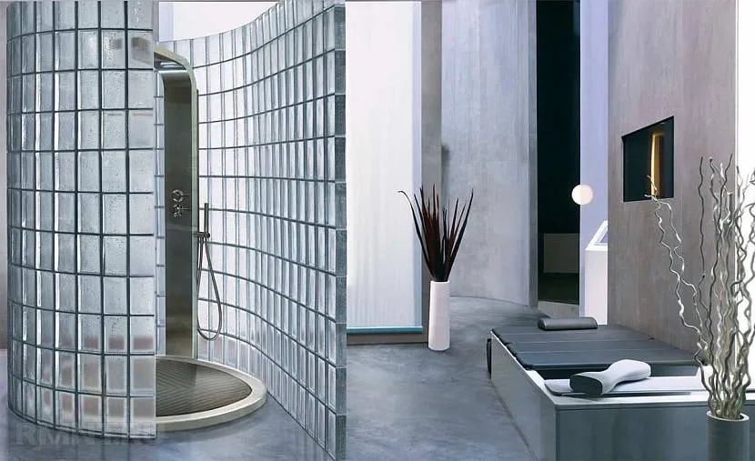 Особенности стеклоблоков – отличная звукоизоляция, влагоустойчивость, хорошее теплосбережение. По этой причине материал часто используют в общественных помещениях для водных процедур. В настоящее время изделия применяют в ванных комнатах и душевых кабинах, выкладывают перегородки, стойки и проемы для окон.