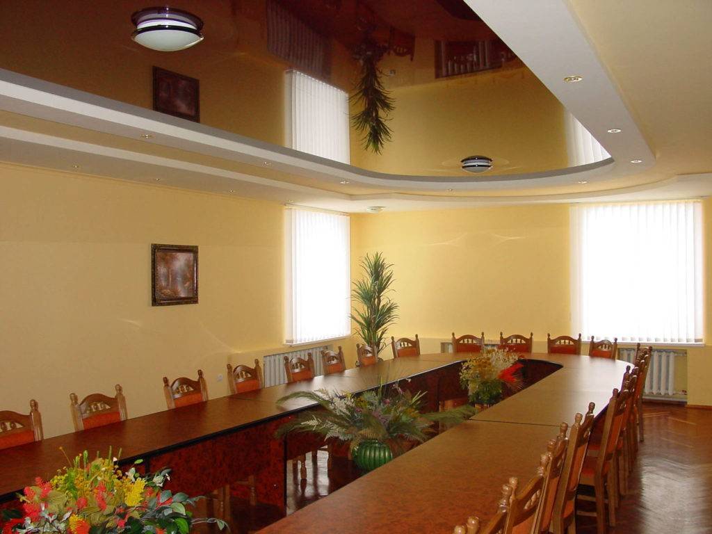 Так как коричневый цвет считается довольно глубоким оттенком, который может успокаивать и способствовать сосредоточению, то будет рационально применить натяжные потолки коричневые в рабочей зоне.