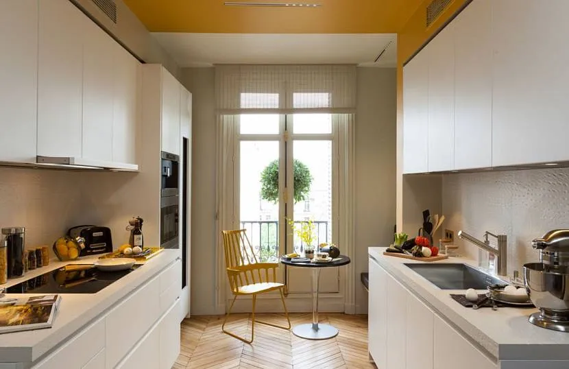 Декоративное оформление двухрядной кухни маленьким столикомИсточник ru.mehomez.com