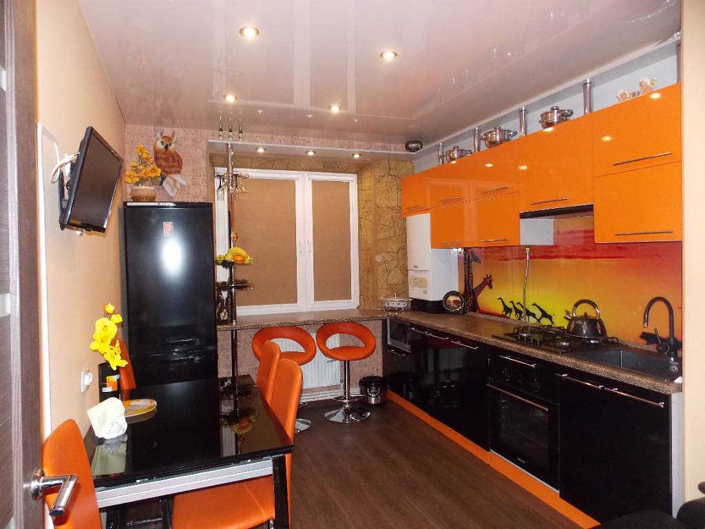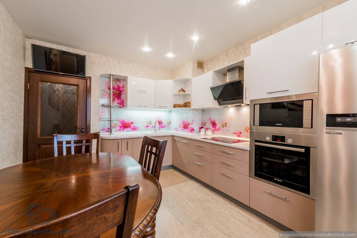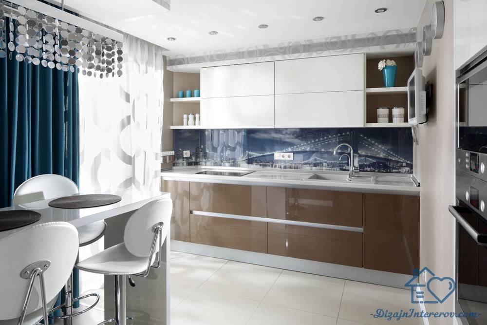 Самым актуальным этот вариант является для маленьких кухонь, так как он визуально расширяет пространство. Идеально зеркальная поверхность впишется в интерьер хай-тек или минимализм. Покрытия в светлых тонах могут быть использованы и в классическом интерьере, а вот для кухни в стиле кантри лучше их не использовать.