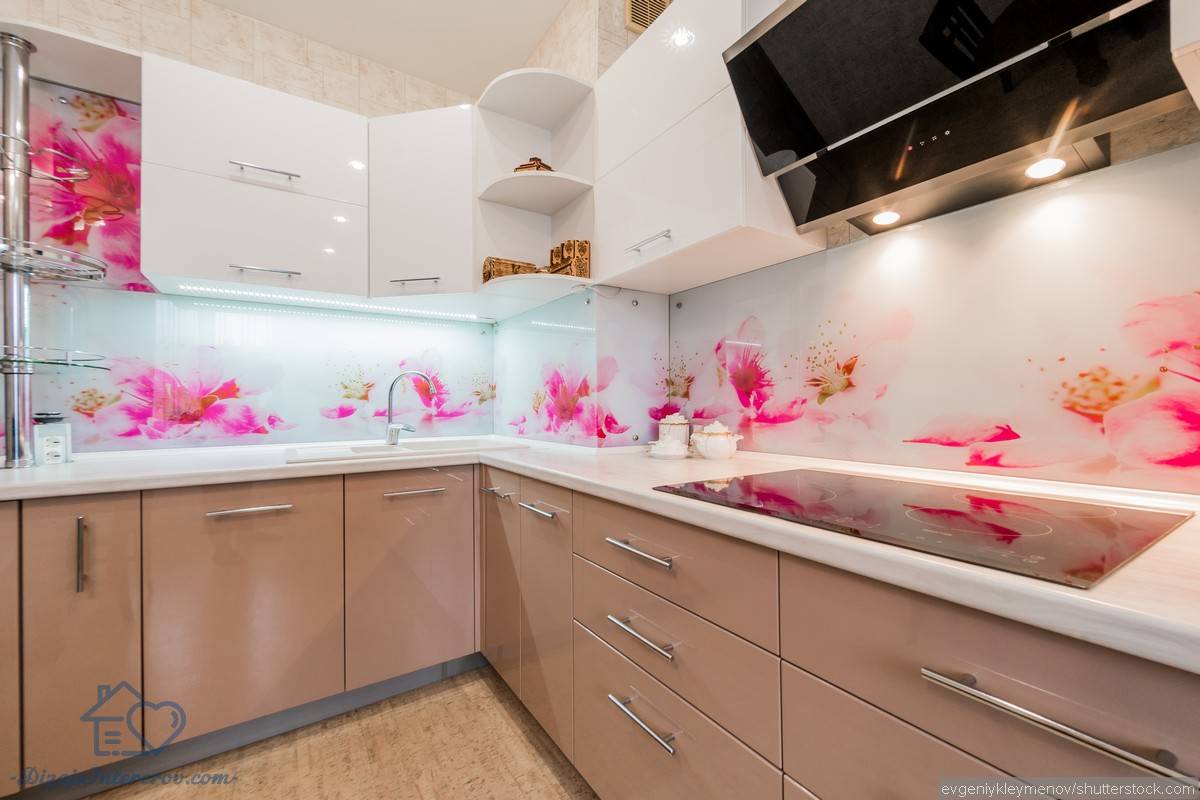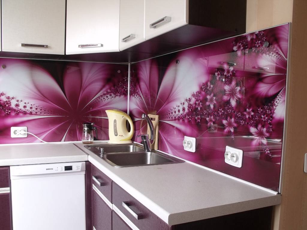 Дизайн: Фартук из акрилового стекла чаще всего оформляется фотопечатью, но также он может быть цветным (однотонным) или просто прозрачным.