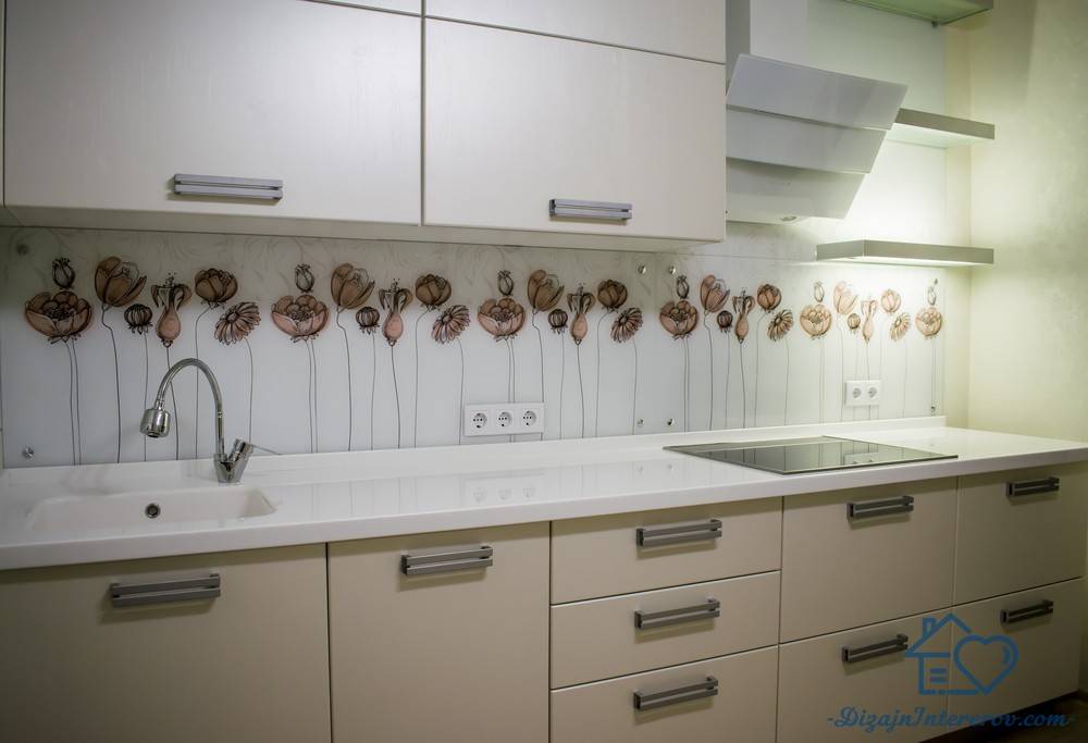 - Цветочный рисунок. Такое оформление, также как и в случае с фруктами, идеально будет смотреться при сочетании с нейтральным цветом стен и простой гладкой, ровной мебелью светлых тонов. Не стоит подбирать цветочный узор в тон общей расцветки кухни, поскольку в этом случае в интерьере не будет никакого акцента.