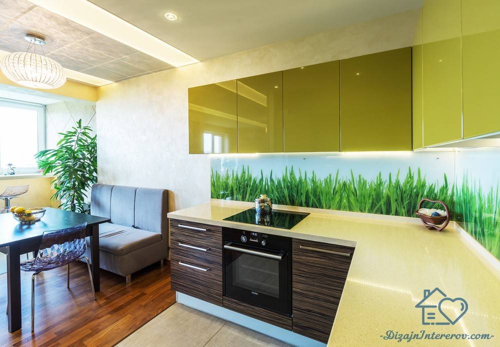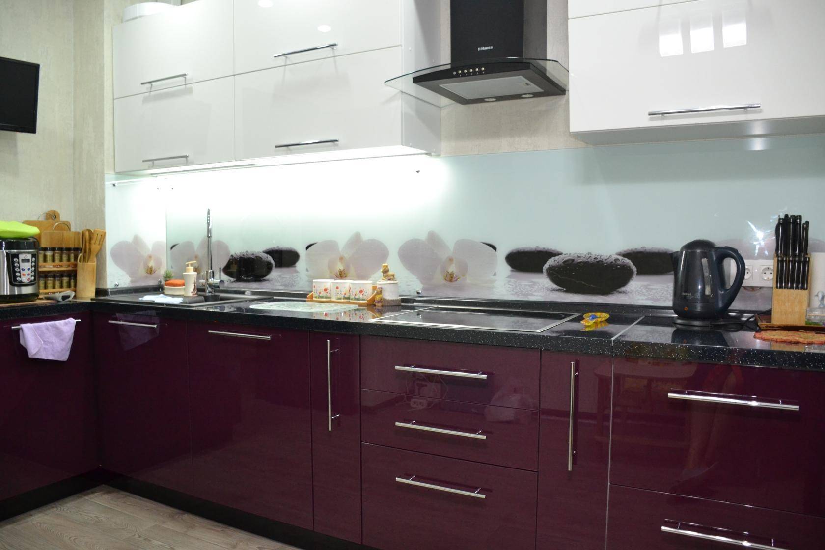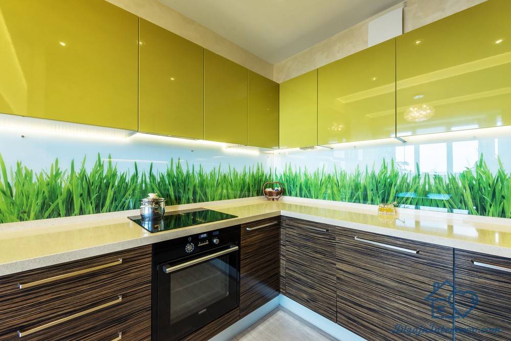 При изготовлении между обычными стеклянными пластами заливается специальный полимер, который окрашивается после отверждения. Такой фартук монтируется без швов, неприхотлив в уходе и хорошо сочетается с акриловыми фасадами. Но учти, что впишется он в основном только в современные кухни.