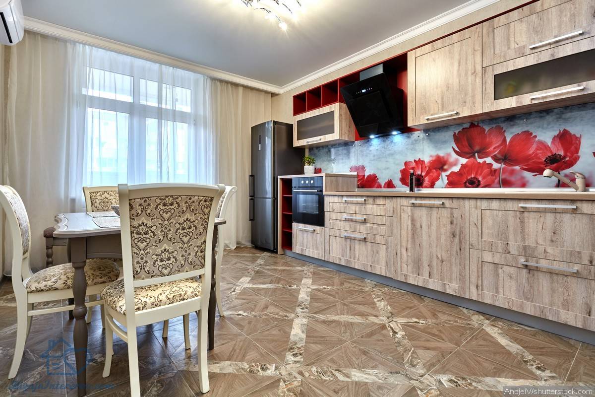 - Природные фактуры. Чаще всего в этой категории встречаются имитации древесины или натурального камня, но вписать их в интерьер кухни, сделав акцент, очень сложно. Как правило, такое решение выглядит слишком строго и неестественно. Стоит избегать сочетания подобного декора с мраморным покрытием столешниц.