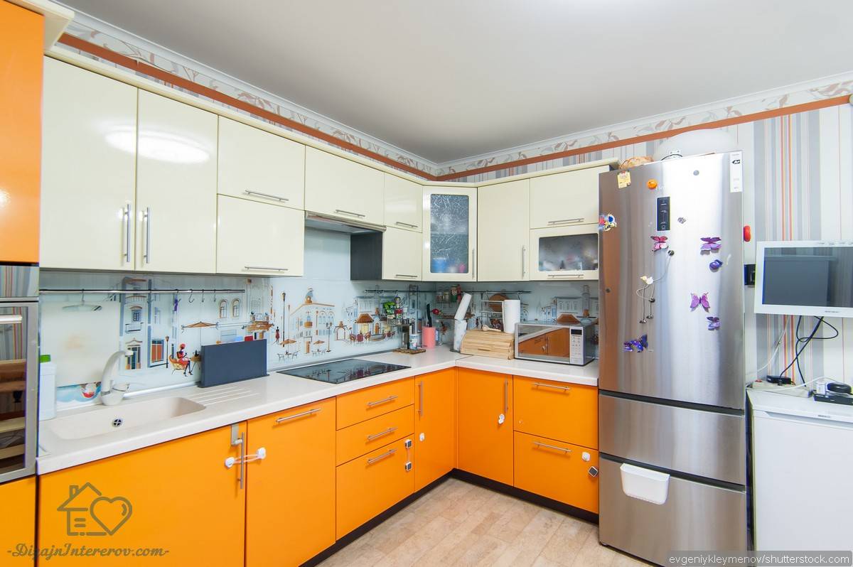 - Модели с рисунками хорошо впишутся в однотонный дизайн. Например, изображение леса на фоне зеленого гарнитура будет выглядеть гармонично. Сочные апельсины рядом с оранжевой мебелью добавят яркости. На фоне голубых или синих фасадов можно использовать изображения моря или неба.