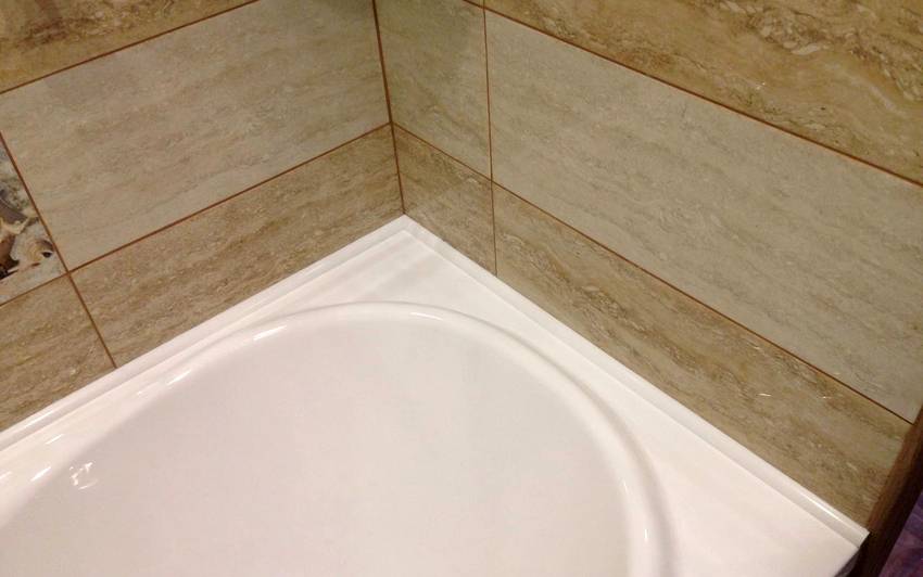 Обратная сторона пластикового изделия содержит специальный резиновый уплотнитель – именно он отвечает за герметичность примыкания бордюра к поверхности. Монтаж изделия из пластика возможен как до облицовки стен керамической плиткой, так и после, однако, ввиду долгого срока эксплуатации кафеля, желательно всё-таки установить его после.