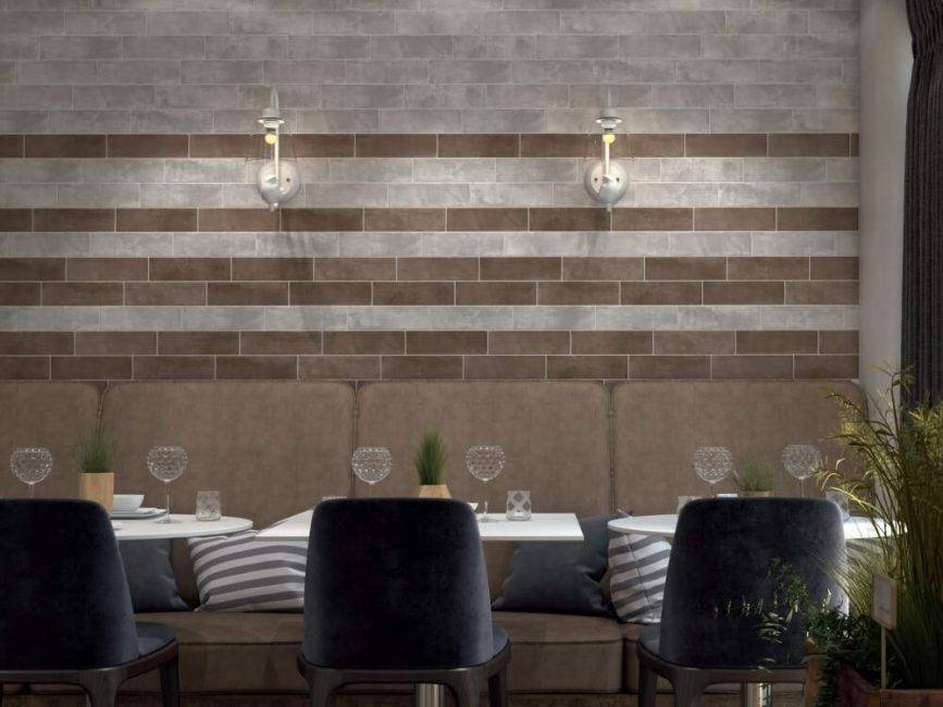 Имитация кирпичной кладки или укладка плитки «вразбежку» – довольно популярный сегодня вариант. Ровные параллельные линии будут или строго горизонтальными, или строго вертикальными. За счет этого можно добиться разных визуальных эффектов. А если комбинировать несколько цветов – то еще и рисунков.