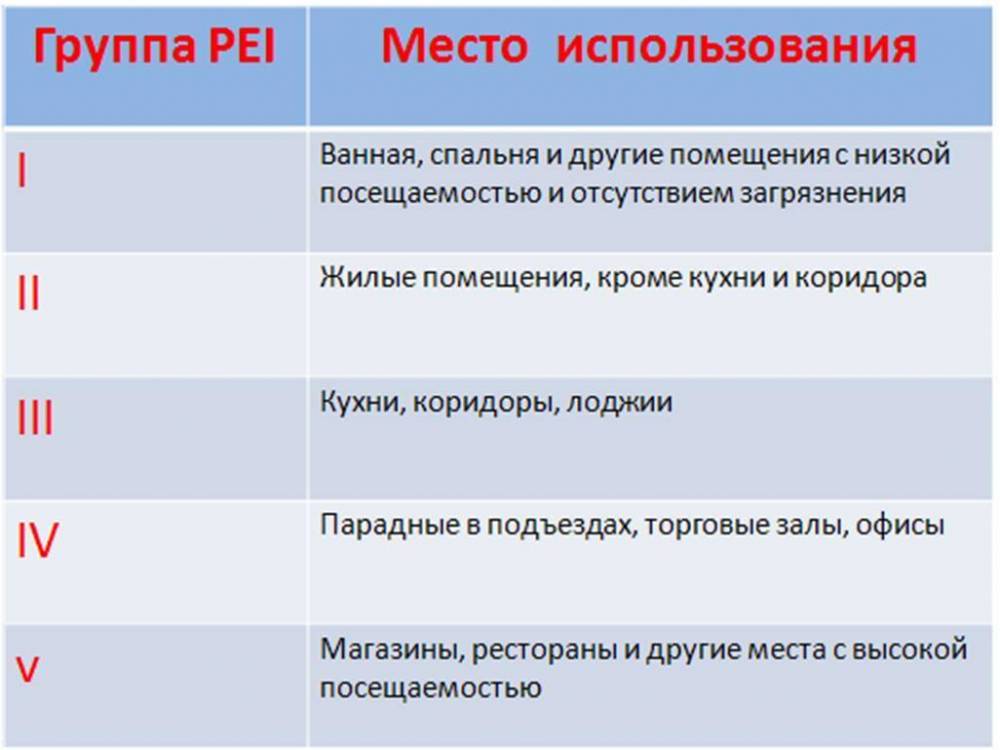 Данное качество глазурованной керамики определяется по пятибалльной шкале. Это способность плитки противостоять интенсивному движению по ней.
