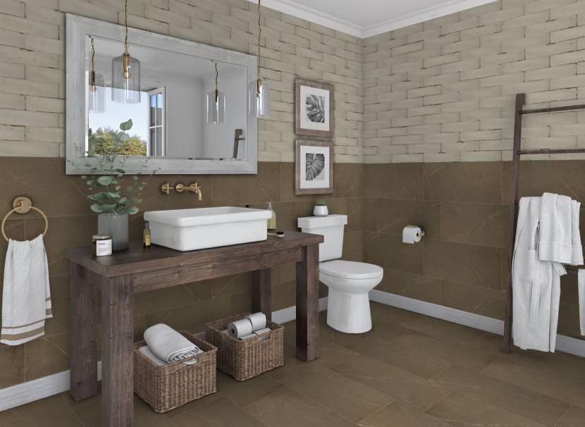 Производители керамогранита и кварцвинила экспериментируют с коричневым цветом, создавая имитацию дерева, гранита, мрамора, оникса.