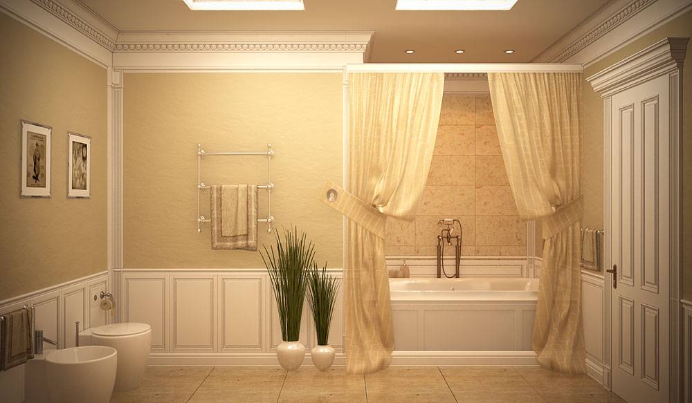 Для отделки рекомендуется покупать плитку светлых сдержанных оттенков — например, белую или светло-коричневую. Двухцветная отделка — отличный вариант, к которому прибегают многие мастера. Единственный крупный недостаток подобного решения — комната должна быть очень большой, иначе вы не сможете прочувствовать роскошь классики.