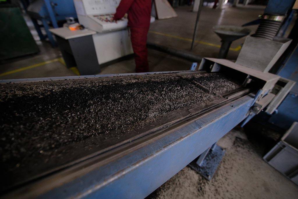 - Лента рубится на квадраты, измельчается и отделяется от основной массы. Остатки резины подаются через резервуар со стальными валами и приобретают состояние пыли или крошки. После такой обработки из исходного сырья выходят любые металлические элементы.
