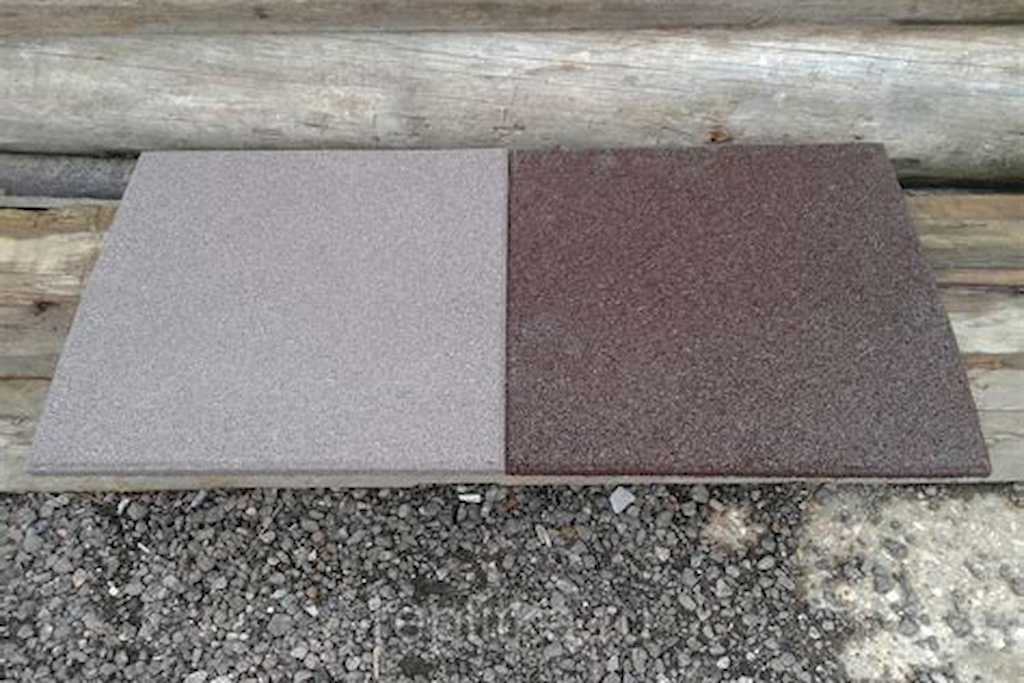 - Полученная консистенция разбавляется клеем для плитки и пигментным красителем. Чтобы сэкономить последнее средство и повысить значения упругости, плитку делают 2-слойной. Верхний слой состоит из мелкоразмерной крошки, а нижний — из резины с фракцией 3-5 мм. Чтобы придать поверхности материала какой-либо цвет, верхний слой разбавляется красителем. При использовании однослойной плитки ее формируют из мелкой крошки.