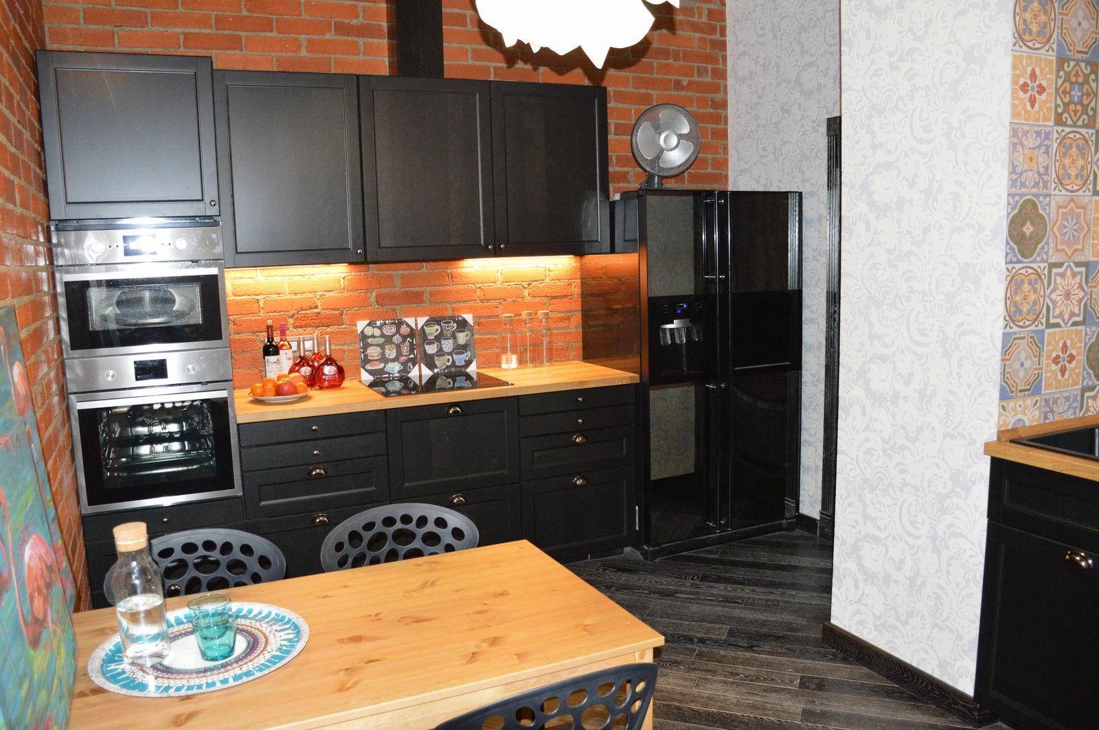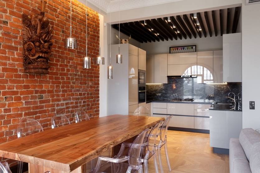 Акцентная кирпичная стена на кухне
