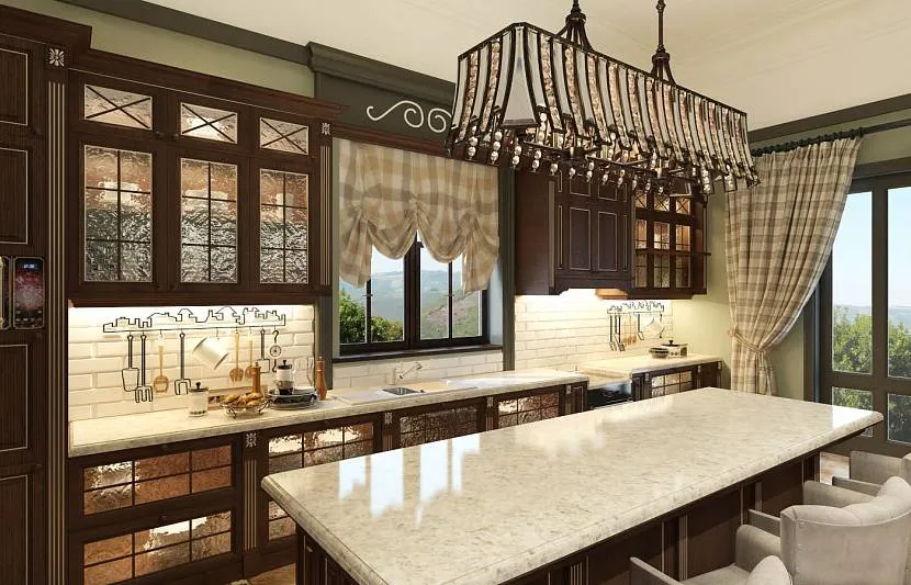 Кухня в английском стиле с имитацией кирпичной кладки в зонеИсточник 5domov.ru