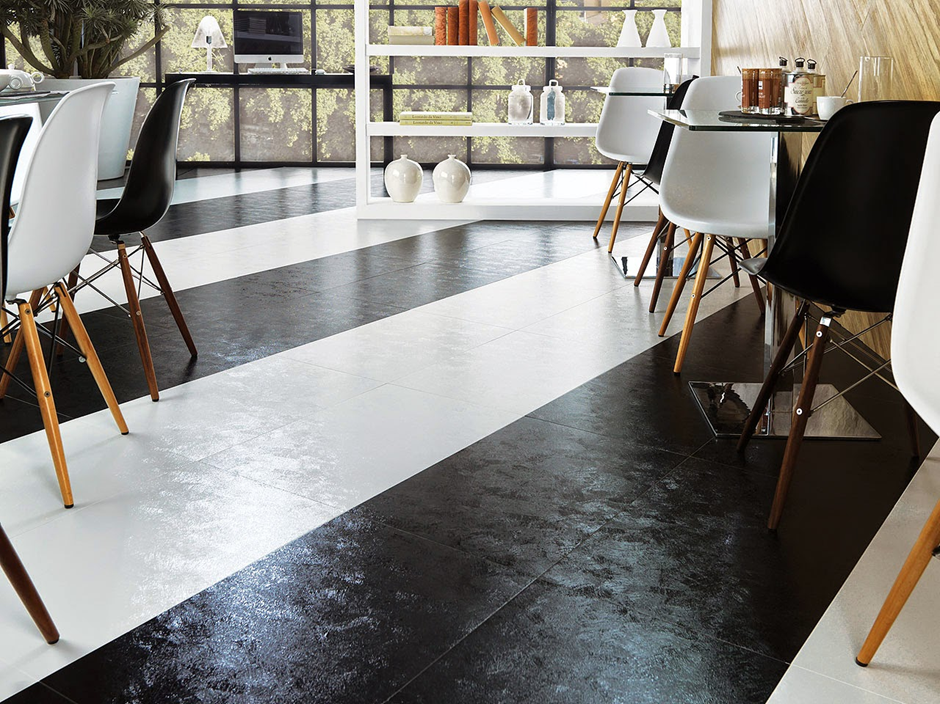 Если керамогранит не полировать, плитку можно сделать более эффектной и неоднородной, сочетая шероховатые и блестящие участки. Такой полуполированный керамогранит называют еще лаппатированным. Его часто применяют в общественных пространствах и местах повышенной проходимости, потому что на неоднородной поверхности неполированного кафеля грязь не так заметна и внешний вид дольше остается безупречным.