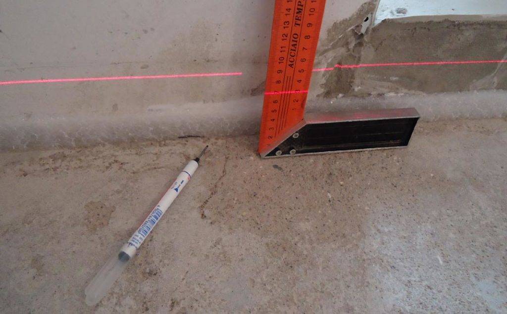 - Обязательно оставляем от стены расстояние, равное 50 мм. Этот небольшой зазор исполнит роль компенсационного стыка, который позволит гасить линейное расширение будущего покрытия.