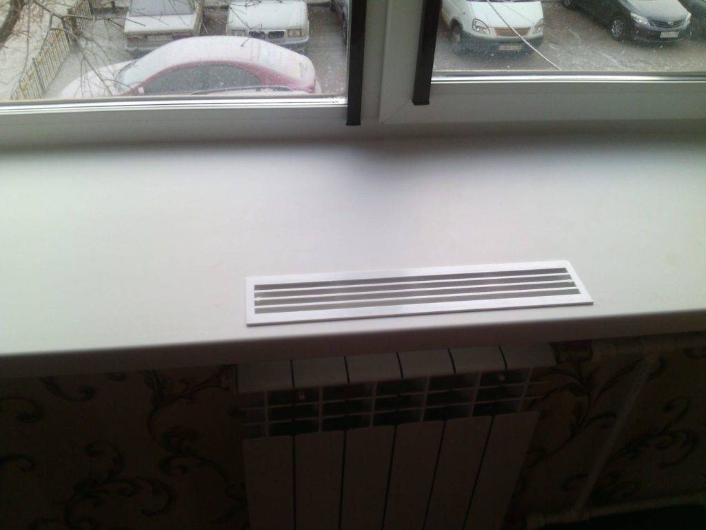 Такой же вариант можно использовать для обогрева обычных окон. Но так как чаще всего между обогревательным устройством и окном находится подоконник, который перекрывает поток горячего воздуха, можно использовать специальные переточные решетки. Они врезаются в подоконник как можно ближе к стеклу.