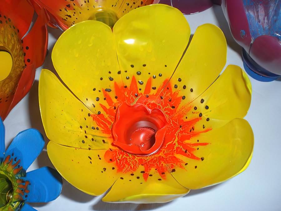 - Пластик нагревается для изменения формы. Нужно быть осторожным, чтобы не перегреть пластик. После охлаждения его лепестки окрашиваются. Нижняя поверхность покрывается акриловой краской. Этот тип краски устойчив к погодным условиям, поэтому его можно использовать для украшения на улице. Если акриловых красок нет, то подойдет гуашь – но игрушку можно будет использовать только дома.