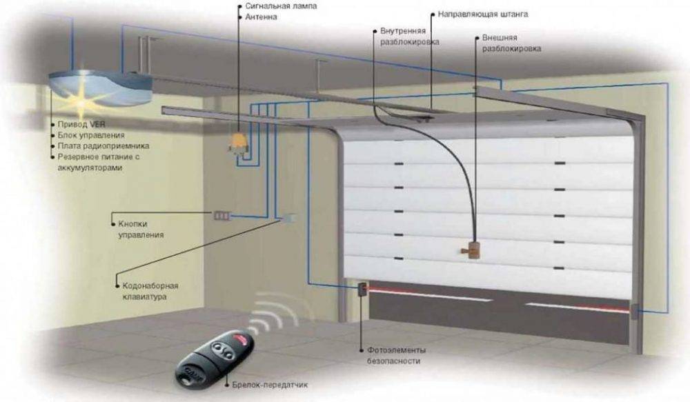 Приводы подъёмных ворот функционируют таким образом, что после закрывания срабатывает блокировка. И подъём полотна с внешней и внутренней стороны проема становится невозможным. Для того чтобы управляющий механизм заработал, необходим сигнал, поступающий на электронику от источника: дистанционного пульта или кнопки на стене гаража.