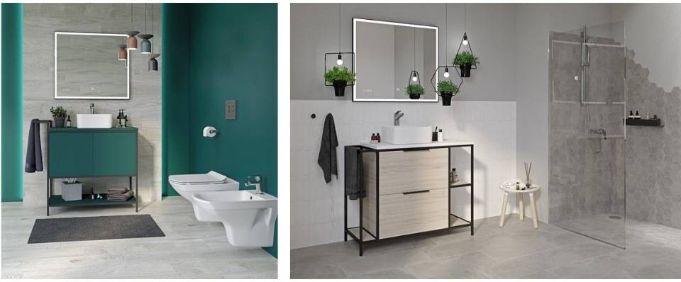 Натуральный камень, стекло и металл тоже применяются в изготовлении мебели для влажных зон. Выполненную полностью из этих материалов мебель найти трудно. Чаще всего в дизайн включают лишь отдельные элементы — металлическую фурнитуру или каркас, стеклянные полки и каменные столешницы. Яркий пример такой мебели от Cersanit — коллекции BOSQUET и . Современные гарнитуры хорошо смотрятся в минималистичных интерьерах, становясь украшением ванной комнаты.