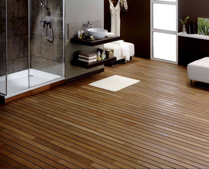 Пол в ванной комнате из дерева выглядит красиво, но отличается очень сложной установкой. Основные плюсы представленного варианта: