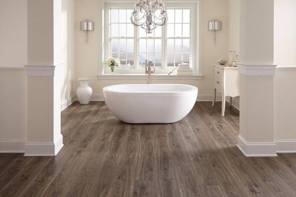 - Последнее место отдаем традиционному ламинату, но и тому варианту, который в своем составе имеет большую часть искусственных материалов. В тоже время необходимо ввести некоторый регламент по поведению в ванной и следить за периодичностью уборки в ванной комнате.