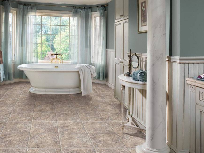 - Четвертый материал в линейке пригодных материалов для ванной комнаты остается за линолеумом. Линолеум не имеет ограничений для применения в условиях санузла.