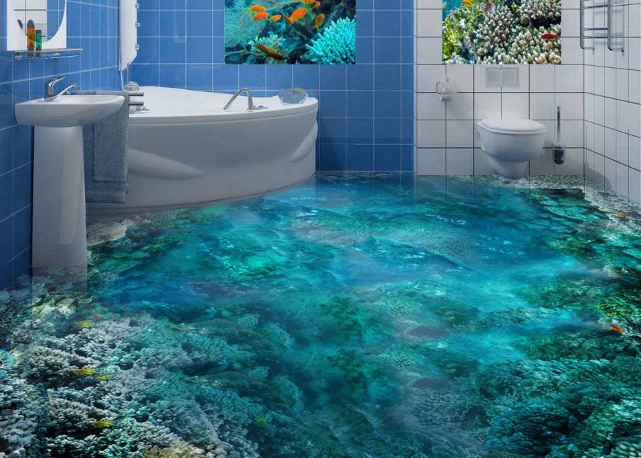 Темой объемного покрытия в ванной чаще всего выступает морская тематика. Уместно смотрятся изображения и элементы декора, связанные с водной стихией и отдыхом. В качестве базового слоя может выступить: