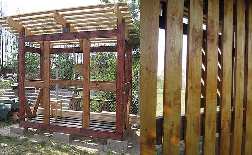 В нем можно уложить довольно много дров. Стены изготавливаются как сплошные, так и решетчатые. Также устанавливается кровля. В таком случае дрова будут защищены от дождя, а решетчатые стены способствуют хорошему просушиванию заготовки.