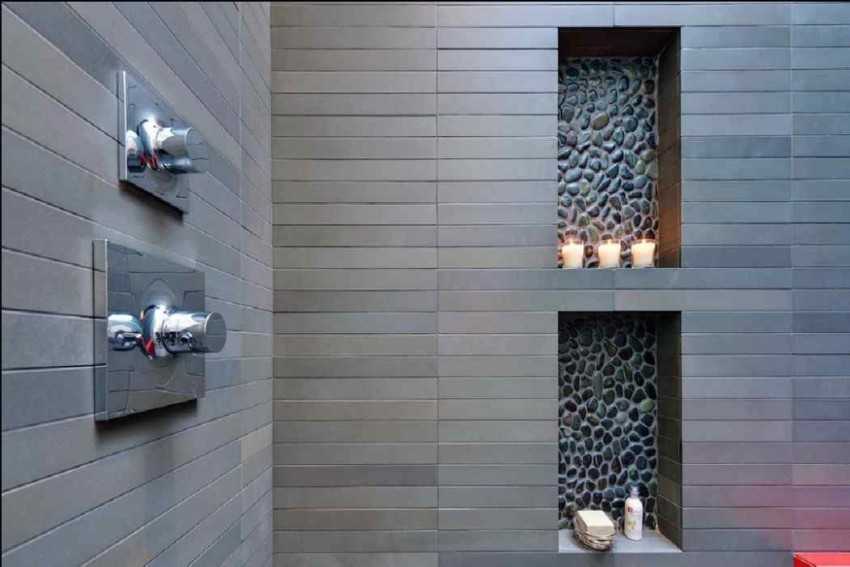 Полка в стене выполняет не только практические, но и декоративные функции. Красивая внутренняя отделка ниши, создание подсветки превращает ее в эффектный акцент интерьера, оригинальное украшение. Привлекательно смотрятся полки в ванной из плитки. В таком оформлении может использоваться:
