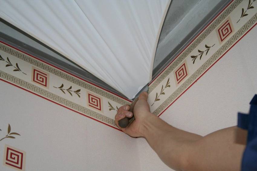 - Непосредственно у стены. Подобное происходит из-за отставания профиля. Пленка демонтируется, профиль заменяется на новый и тщательно крепится. Потом полотно вставляется на место.