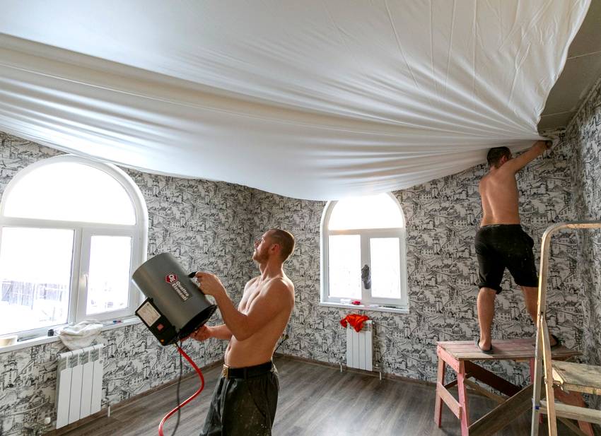 Перед тем как натягивать натяжные потолки своими руками, пленку необходимо разогреть. Если снималась часть полотна, строительного фена будет достаточно. При полном снятии и вторичном натягивании без тепловой пушки не обойтись. Следует отметить, что самостоятельно убрать пленку гораздо проще, чем установить. Для натягивания необходим опыт или хотя бы уверенность в собственных силах. Потребуются все те же действия, что и при первичном монтаже.