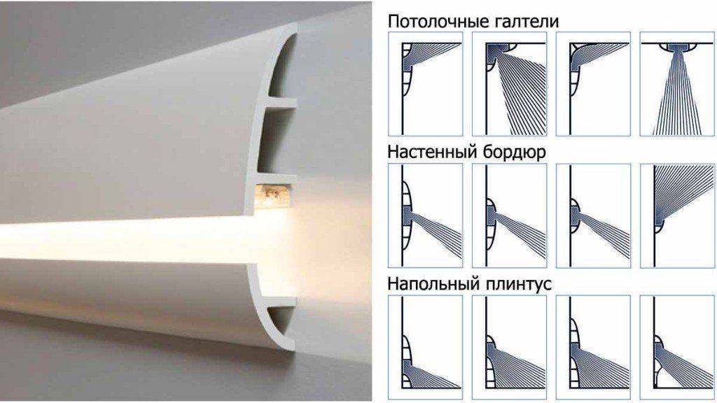 Другими словами, галтели для подсветки имеют форму, специально разработанную для установки источников освещения. В ряде случаев используются потолочные карнизы, напоминающие собой металлический профиль. В такие расходные материалы обычно устанавливают осветительные лампы разных видов.