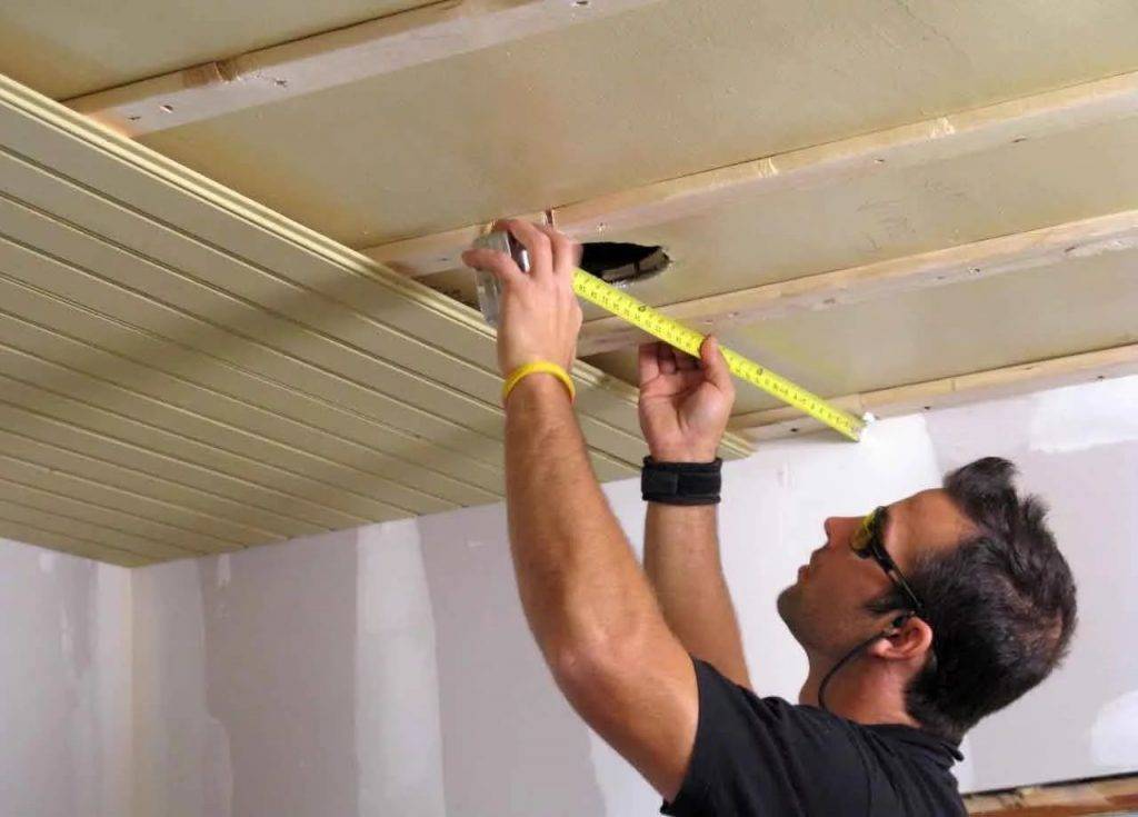 - В первую очередь на потолок крепят деревянные рейки, сечением 20х30 мм, нужно сделать 4-5 линий опоры панелей;